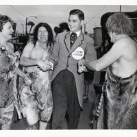 Oregon Governor Mark Hatfield meets cavemen at the Gay Nineties festival version 2