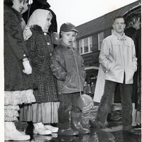 A black and white photograph by Allan J. de Lay featuring child parade-goers watching the 1961 Gay Nineties parade. Forest Grove resident Nancy Kane is pictured in the far left of the photograph.