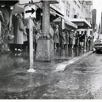 A black and white photograph by Allan J. de Lay featuring Gay Nineties parade-goers on the sidewalk of Pacific Avenue in 1961.
