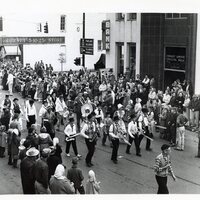 A black and white photograph of a children's marching band participating in the Gay Nineties parade in the 1950s or early 1960s. The photograph was taken on the corner of Pacific Avenue and Main street. Ellis Lucia, who potentially took this photograph, worked for the Forest Grove News Times.
