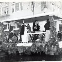 A black and white photograph by Allan J. de Lay featuring the Quaring Nursing Home's county fair food judging parade float at the 1961 Gay Nineties parade.