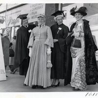 A black and white photograph by Allan J. de Lay featuring a group in costume and academic dress at the Gay Nineties festival in 1962.