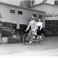 A black and white photograph featuring Russell Crocker giving Lee Brattan a bicycle ride during the first Gay Nineties festival in 1947. The photograph was taken in front of the location of the current feed store on 19th avenue. The photographer is unknown, but it may have been Allan J. de Lay, a staff photographer for The Oregonian who took numerous photographs of the event over the years.