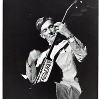 A black and white photograph by Allan J. de Lay featuring Eddie Peabody, famous banjo player and the guest talent of the 1961 Barbershop Ballad Contest, performing at the old Forest Grove High School in 1961.