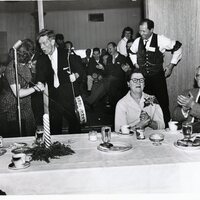 A black and white photograph by Allan J. de Lay featuring Eddie Peabody, famous banjo player and the guest talent of the 1961 Barbershop Ballad Contest, at the annual quartet breakfast.
