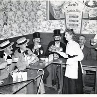 A black and white photograph featuring Lee Brattan serving donuts to barbershop quartets at Hundley's Donut Bar during the first annual Gay Nineties festival in 1947. Ray Hoss/ Hass is pictured at second left, and Mayor Hughes is pictured as the leftmost gentleman with a top hat. The photographer is unknown, but it may have been Allan J. de Lay, a staff photographer for The Oregonian who took numerous photographs of the event over the years.