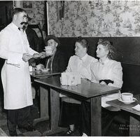 A black and white photograph featuring a waiter serving donuts to barbershop quartets at Hundley's Donut Bar during the first annual Gay Nineties festival in 1947. Lee Brattan and Mrs. Timmerman are pictured seated. The photographer is unknown, but it may have been Allan J. de Lay, a staff photographer for The Oregonian who took numerous photographs of the event over the years.