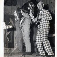 A black and white photograph featuring Big Tool and Little Tool, the 1956 Barbershop Ballad Contest's special guests. The photographer is unknown, but it may have been Allan J. de Lay, a staff photographer for The Oregonian who took numerous photographs of the event over the years.