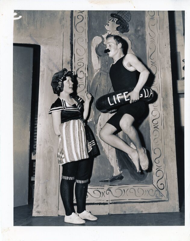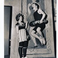 A black and white photograph featuring two teenagers in Gay Nineties swimming attire in the late 1940s or 1950s. The photographer is unknown, but it may have been Allan J. de Lay, a staff photographer for The Oregonian who took numerous photographs of the event over the years.