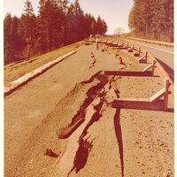 A photograph featuring the Henry Hagg Lake road landslides, taken by a staff member of US Congressman Les AuCoin in early 1982. Multiple slides were discovered on the roads bordering Henry Hagg Lake, including SW Scoggins Valley Road and SW West Shore Drive.