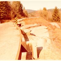 A photograph featuring the Henry Hagg Lake road landslides, taken by a staff member of US Congressman Les AuCoin in early 1982. Multiple slides were discovered on the roads bordering Henry Hagg Lake, including SW Scoggins Valley Road and SW West Shore Drive.