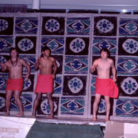 Four male dancers wearing red malo at Pacific University's annual Lu'au, probably between 1971-1973. They are identified on the original slide from left to right as students and alumni Mike Ben (Class of 1971), John Saplan (Class of 1973), Nathan Kurisu (Class of 1972) and Flor Matias (Class of 1972). This may have been at a rehearsal: the cardboard paper at the base of the stage would be covered with greenery and flowers during the actual performance.