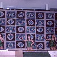 Three women dancers performing at Pacific University's annual Lu'au probably between 1971-1973. They are wearing green satin dresses. They are identified on the original slide as: Phyllis Hayashida (Class of 1973); Lynn Shibuya; and Cora Watanabe (Class of 1973). This may have been at a rehearsal: the cardboard paper at the base of the stage would be covered with greenery and flowers during the actual performance.