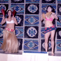 Two Pacific University students, identified on the original slide as Cathy Chung (Class of 1973) and Leila Tong. They are performing at the university's annual Lu'au probably between 1971-1973. Chung is wearing a grass skirt. This photograph appears to have been taken during a rehearsal: the cardboard at the base of the stage would be covered with flowers and greenery during the actual performance.