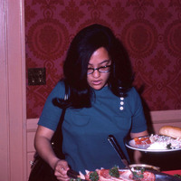 Pacific University student Marylee Moon (Class of 1970) getting food at a buffet line, possibly at an event hosted by Pacific University's Haumana O Hawai'i (Hawaiian Club) circa 1970-1973.