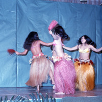 Dancers performing while wearing Tahitian-style tasseled grass skirts and bikini tops and holding grass hand tassels. This took probably place at Pacific University's annual Lu'au circa 1970. The picture may have been taken at a rehearsal or other event, as none of the performers are wearing the leis that were typical of the main Lu'au performance. It is also possible that it was taken during an alternate Fall dance performance hosted by Haumana O Hawai'i (Hawaiian Club).