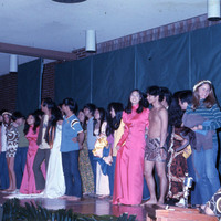 Performers from Pacific University's Haumana O Hawai'i (Hawaiian Club), possibly at a rehearsal for the annual Lu'au circa 1970. It is also possible that it was taken during an alternate Fall dance performance.