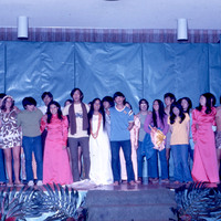 Performers from Pacific University's Haumana O Hawai'i (Hawaiian Club), possibly at a rehearsal for the annual Lu'au circa 1970. It is also possible that it was taken during an alternate Fall dance performance.