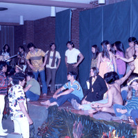 Pacific University students apparently rehearsing for the annual Lu'au performance circa 1970. It is also possible that the image was taken during an alternate Fall dance performance by Pacific University's Haumana O Hawai'i (Hawaiian Club). The "Queen" of the Lu'au is wearing the Queen's costume, a white satin dress, over her street clothes. Other members of the cast are wearing street clothes. The stage decorations appear to be partially completed.