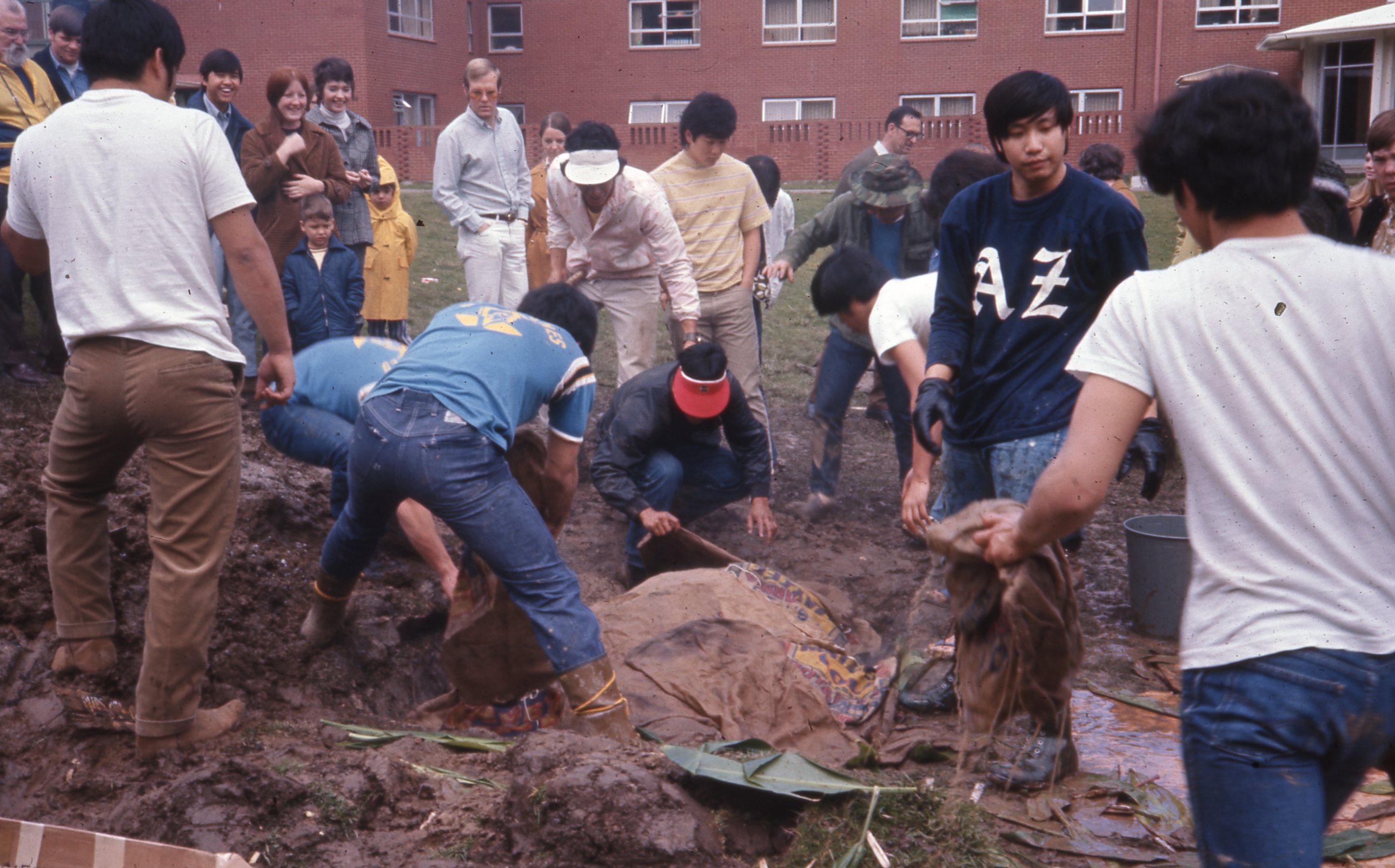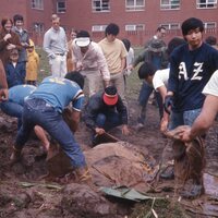 A group of students preparing a kalua pig roast at Pacific University's annual Lu'au, while others observe. One student is wearing an "AZ" (Alpha Zeta) fraternity shirt. This photograph was probably taken around 1971.