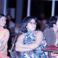 A group of Pacific University women students attending the university's annual Lu'au, probably in 1971. They are identified on the original slide from left-to-right as: Mary Aoki; Sue Arisumi (Class of 1971); and Faith Nagasawa (Class of 1973).