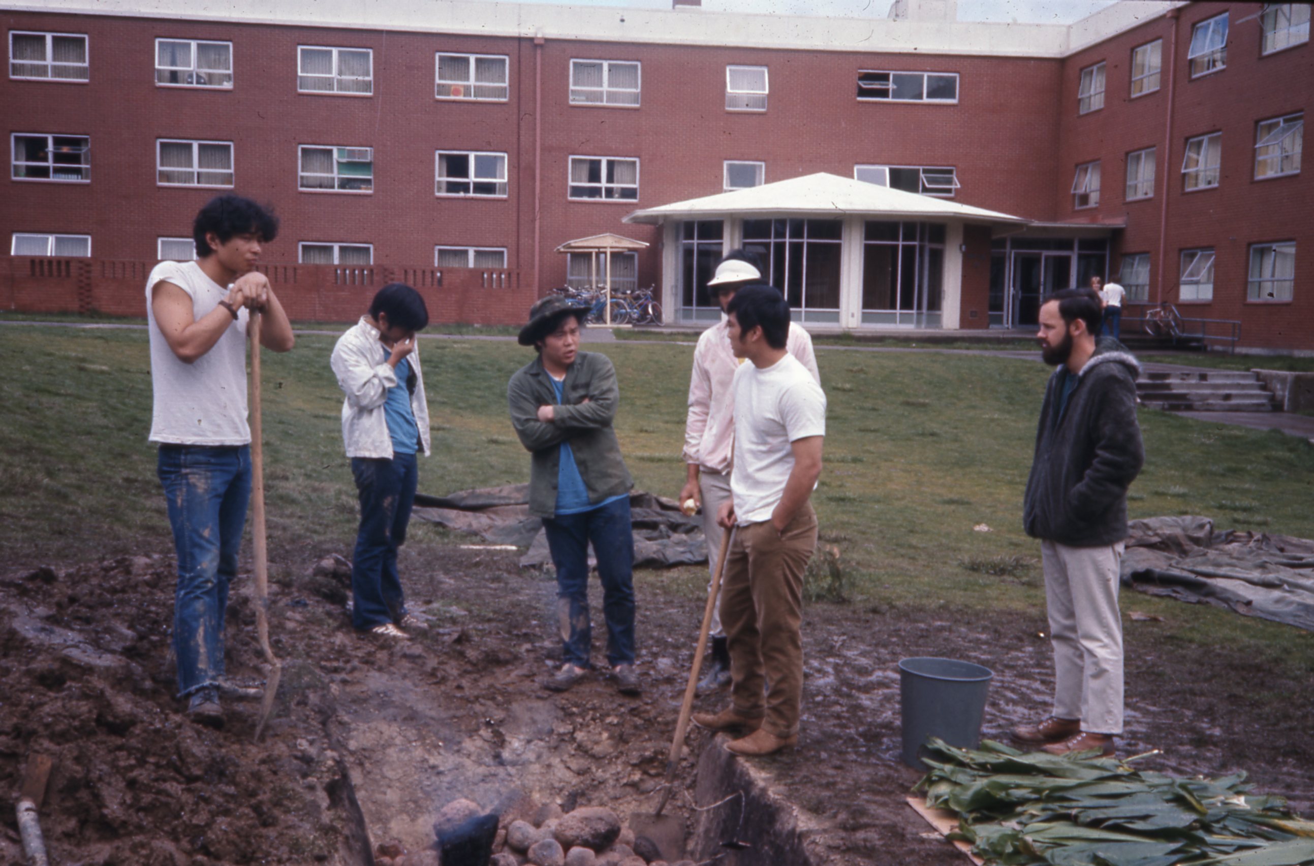 A group of students tend the kalua pig roasting pit at Pacific University's annual Lu'au, probably in 1971. Clark Hall appears in the background. Hot coals and banana or ti leaves are visible in the foreground.