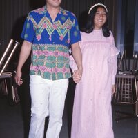 Two Pacific University students modeling Hawaiian clothes, probably at the university's annual Lu'au in 1971. According to the student newspaper, the Hawaiian Fashion Show was one of the events during that year's performance.