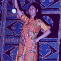 Pacific University student Gail Miyazono (Class of 1972) performing a dance on stage at the university's annual Lu'au, probably in 1971. She is holding what appears to be "poi" (a tethered ball used in Maori-style dances).