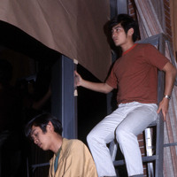 Two students with a ladder, by the windows of Washburn Hall during one of Pacific University's annual Lu'aus, probably in 1969 or 1970. They are covering the windows with paper to black them out for the Lu'au performances.
