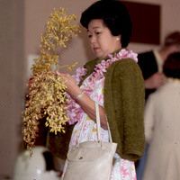 A woman with a lei, identified on the original slide as "Daisy," holding what appear to be yellow orchids at Pacific University's annual Lu'au circa 1969-1970. She is likely the relative of a Pacific University student who was performing in the Lu'au. The parents of Hawaiian students would ship fresh flowers via from Hawai'i each year for this event, which were used as decorations or sold as concessions.
