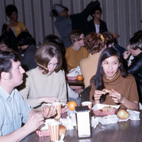 A group of Pacific University students eating what appears to be a teriyaki chicken dinner during an event on campus. This dinner may have taken place during Homecoming weekend in 1970, when the Freshman class hosted a dinner with entertainment; or at another event connected to Haumana O Hawaii (Hawaiian Club).