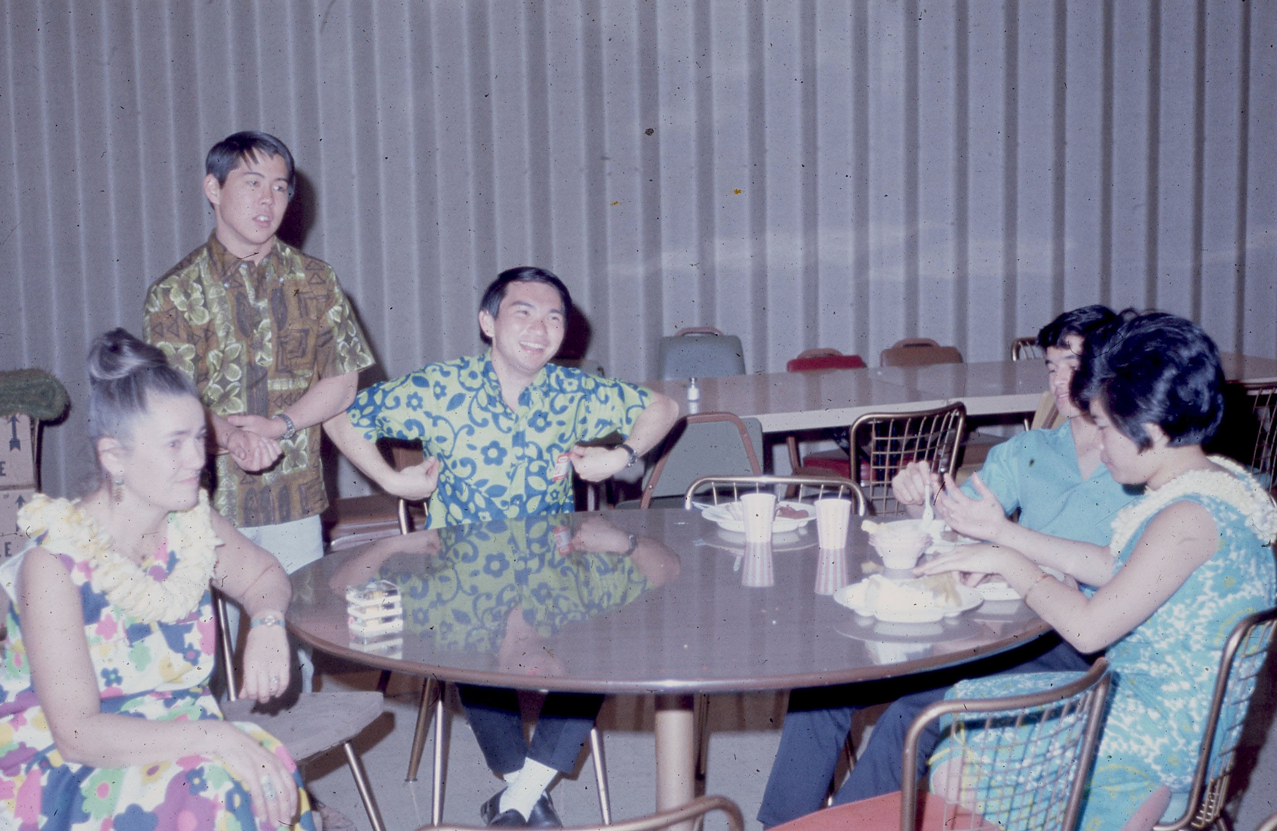 Pacific University students and/or relatives eating at the university's annual Lu'au circa 1969-1970. This photograph was probably taken in the Multi-Purpose Room (MPR) of Washburne Hall.