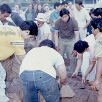 Pacific University students and/or relatives tending the kalua pig roast during the university's annual Lu'au circa 1969-1970. The air appears to be smoky from the fire.