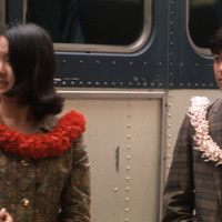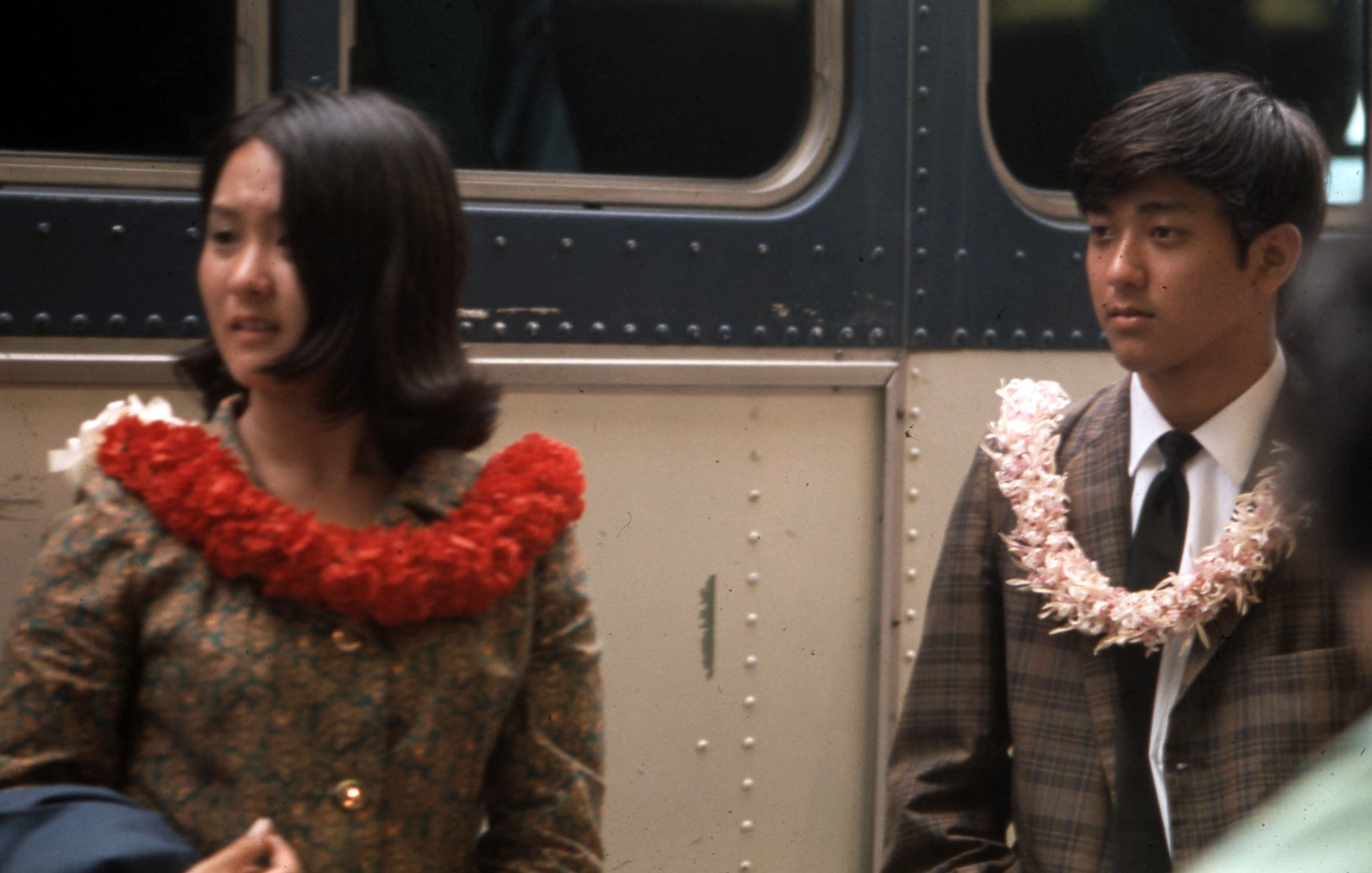Two Pacific University students wearing leis and standing by what appears to be a bus, during the university's annual Lu'au circa 1969-1970.