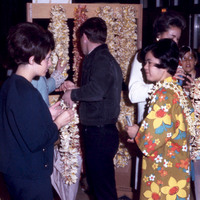 A vendor selling leis stands by a concession stand at Pacific University's annual Lu'au, probably in 1969 or 1970. Customers are examining the leis. A sign notes the prices: Plumeria leis, $1; Plumeria w/ vanda, $2; Vanda orchid, $2.50; Crown flowers, $1. Revenues from concessions at the Lu'au went towards scholarships for Haumana O Hawai'i (Hawaiian Club) students. Students' family members shipped flowers, leaves and other fresh materials by air to supply the event.