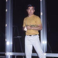 A male student stands by the windows of Washburn Hall during one of Pacific University's annual Lu'aus, probably in 1969 or 1970. Based on other slides found with this image, he was likely preparing to cover the windows with paper to black them out for the Lu'au performances.