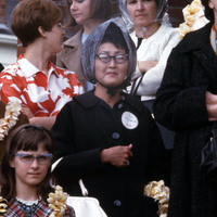Sue Yokouchi with several other parents and relatives of students getting ready to attend Pacific University's annual Lu'au, circa 1969-1970. Sue Yokouchi was likely the mother of Karen Yokouchi, Pacific University Class of 1972.