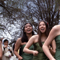 Pacific University women students dressed in green satin dresses and beaded headbands, on their way to perform at the annual Lu'au in 1969 or 1970. The woman in the background holding a camera is identified on another slide as "Miyazono," and is probably a relative of Pacific University student Gail Miyazono, of the Class of 1972.