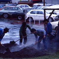 Students from Haumana O Hawai'i (Hawaiian Club) tend the kalua pig pit roast at Pacific University's annual Lu'au in 1986. It rained during the event that year, which rarely happened during Lu'au.