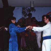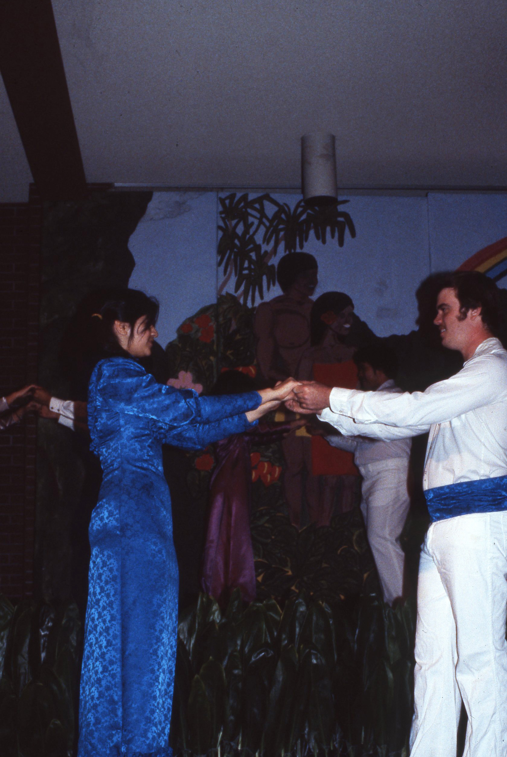 Several couples perform a dance on stage at Pacific University's annual Lu'au in 1982.