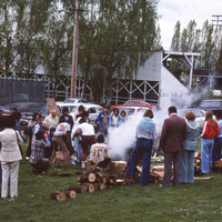 Pacific University students from Haumana O Hawai'i (Hawaiian Club) tend the kalua pig roasting pit at Pacific's annual Luau in 1978.