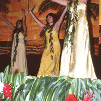 A group of women wearing long, sleeveless dresses and maile-style leis, dancing what appears to be the hula at Pacific University's annual Lu'au in 1978.