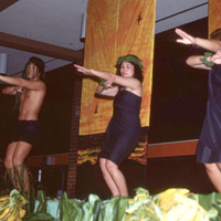 A group of student dancers performing on stage in black outfits, at Pacific University's annual Lu'au in 1978. Another performer holding an ipu gourd sits on the left.