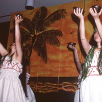 Dancers in white and tan dresses hold up what appear to be bowls made from coconuts, on stage at Pacific University's annual Lu'au in 1978.