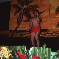 Burt Yamaoka (Class of 1980) performing on stage at Pacific University's annual Lu'au in 1978. His identification is based on an report from the student newspaper, which described him as performing a "knife dance from Samoa" during this event.