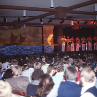 An audience watches musicians and singers on stage at Pacific University's annual Lu'au in 1977. The student newspaper later described the musical performers at this Lu'au: "The band provided beautiful solos done by Danny Sagadraca, Lyle Galdeira, and Gary Pacarro. Music arrangements were provided by Keoki Awai. For the first time, the band featured a female vocalist. Ernette Barreira, a sophomore speech pathology major, sang with the band." (The Index, Apr. 28, 1977)