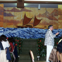 Attendees eat dinner at Pacific University's 1977 annual Lu'au. The stage backdrop, which depicts a catamaran sailing on the ocean, appears in the background.