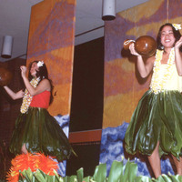 Dancers with ipu and ti leaf skirts at the 1977 Luau