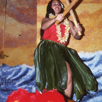 A female dancer wearing a ti leaf skirt and holding pu'ili sticks at Pacific University's annual Lu'au in 1977.