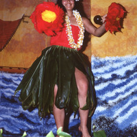 A female dancer wearing a ti leaf skirt and carrying 'uli'uli (feathered rattles), on stage at Pacific University's annual Lu'au in 1977.
